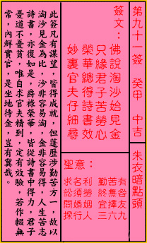 | 签文 | 佛说淘沙始见金,只缘君子不劳心;荣华总得诗书效,妙里工夫仔细寻 |