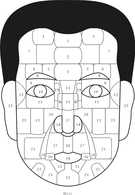 15)是"山根",有痣的人,因富有责任感,而精神、肉体和经济上多苦劳。尤其肠胃不健康。有死痣者,无责任感、懒散,经常发生事情,麻烦别人。女性的"山根"有活痣,不轻易结婚,若结婚也会因先生病弱,而须担负家计。