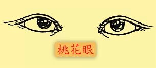 眼长,眼尾略弯。眼睛水汪汪似的,四周略带红晕,眼形似若桃花,睫毛长,眼尾稍向上翘,瞳仁常往上面作斜视,黑白并不分明,眼神似醉非醉,令人有点朦胧而奇妙的感觉,所谓回眸一笑或临去秋波,教人心荡意牵!