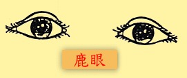 睑阔波长,黑白分明,上眼睑中央部份略为突出,瞳孔位于眼的中央,眼神明润。这种人头脑保守,有点优柔寡断,遇事提心吊胆,往往为一些根本微不足道的事、惊骇失措,所以形容为「鹿骇」;他却是非常善良而富正义感,为朋友的事,不计较自己的得失,而毫无条件的帮忙,而且信诺必行,最重感情,因此被认为交朋友最好的对象;他健步如飞、动作快、喜欢游山玩水,长寿,必须其它条件好,晚景才会不错。