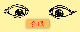 特征是上三白眼,眼眶深陷,眼光尖锐,眼神异常,尤其兴奋时瞪人更为明显;眼瞳带黄褐色,常常低头反顾,蹙眉而视,有着一种欠理性的凶暴眼光,心毒多妒,贪婪好淫,是流氓、太保,以及凶暴精神病患者的眼,多因怠惰而贫穷,据说德国纳粹杀人魔王希特勒,就是狼眼的典型人物。