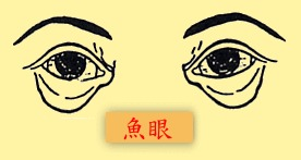 眼睛比较圆,上眼皮靠近眼梢三分之一的地方往下垂,好像盖住眼珠似的,眼白混浊不清,没有什么光彩,眼的动作很迟钝,好像露神不动睛。玄灯师傅以为这种人体质弱,好像虚脱没有气力似的,做事都不能彻底完成,虽然有讨人喜欢的一面,能够配合别人,但结交的都不是什么益友,假如好色多淫、消耗过多,就会像神异赋所说:「睛如鱼目,速死之期」,以致病弱不寿。